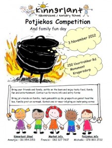 Kinnerlant Kleuterskool gaan ‘n potjiekoskompetisie op 3 November 2012 aanbied en nooi julle uit om deel te kom neem aan die pret. Ons gaan lekker musiek speel, fantastiese stalletjies en opwindende kindervermaak hê.